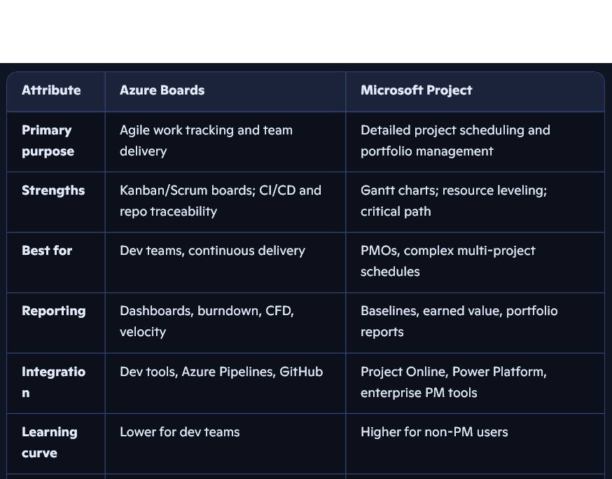 Use Azure Boards for agile software delivery, CI/CD integration, and team-level execution; use Microsoft Project for formal schedule control, resource leveling, and portfolio planning